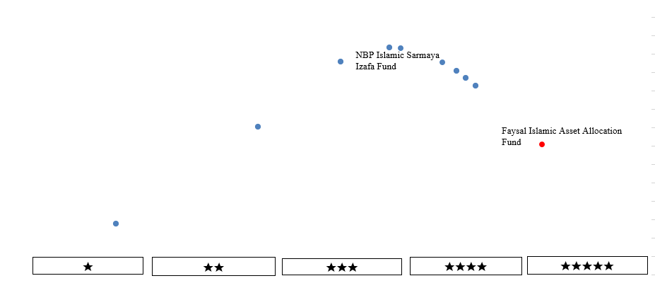 Over the past five years, Pakistan’s capital markets have navigated persistent macroeconomic and structural challenges, including IMF program delays, fiscal imbalances, political instability, and pronounced swings in policy rates and inflation. Currency depreciation, a widening current account deficit, and shifting investor sentiment periodically tested market stability. Yet, the Islamic Asset Allocation category has demonstrated notable resilience, with PACRA ranking two funds out of twelve peers. The category’s average 5-year return was ~124.89%, while the top performer delivered ~202.63%, largely driven by aggressive equity positioning. Faysal Islamic Asset Allocation Fund (FIAAF) delivered a 5-year return of ~100.26%, below the category average but accompanied by one of the lowest volatility levels and among the highest risk-adjusted returns (~4.32%) in the peer group. The Fund’s 5-Star ranking reflects PACRA’s recognition that its consistent performance came with significantly lower downside risk, an outcome of its conservative, liquidity-focused investment approach.