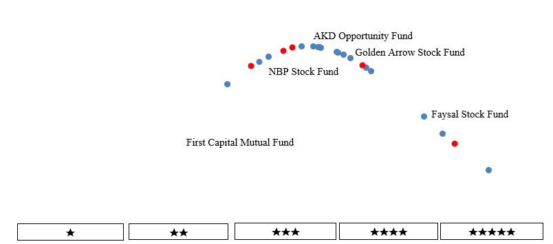 Over the five-year horizon, Pakistan’s equity markets experienced significant volatility driven by macroeconomic imbalances, currency depreciation, and political uncertainty. Despite these challenges, a strong bull run in FY25 restored investor confidence and lifted overall returns. PACRA is rating 5 funds out of 23 funds in Equity category, with the category delivering an average return of ~184.76%, while the top-performing fund achieved an impressive ~302.87%, while AKD Opportunity Fund posted a return of ~155.69%, maintaining its 3-star rating over the 5-year horizon. As of Jun’25, the Fund held ~87.6% in Equities, ~0.88% in Cash, and the remaining ~11.52% in Others including receivables. Sector allocation included ~26.15% in Inv. Banks/ Inv. Cos./ Securities Cos., ~12.21% in Textile Spinning, ~11.74% in Insurance, ~8.26% in Technology & Communication, ~7.63% in Power Generation & Distribution, and the remaining ~21.61% was spread across other sectors.